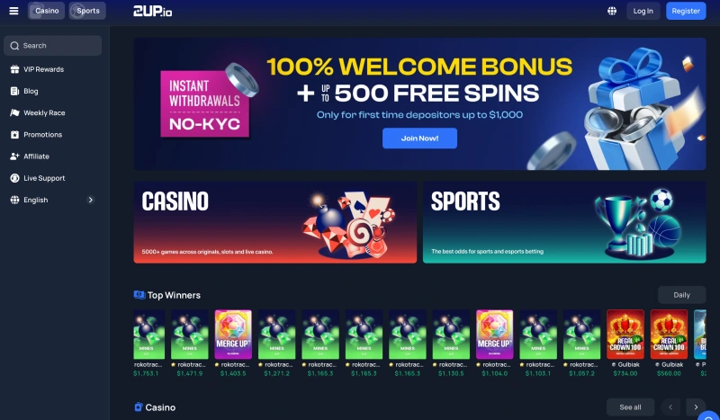 The casino hosts over 9,000 game titles like slots, 2UP originals, live casino, and an immersive sportsbook. All 2UP casino games are from top software providers such as Pragmatic Play, Hacksaw Gaming, PG Soft, Nolimit City, Novomatic, Relax Gaming, and so on. For convenient payment, this casino supports both fiat and cryptocurrency payment methods.