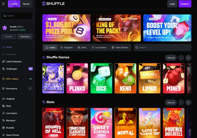Shuffle Casino is one of the latest crypto casinos with a native token, SHFL. The casino is owned by Natural Nine B.V. and licensed by the Curaรงao Gaming Control Board, making every activity in this casino legal and safe. When it comes to game selection, this casino is a home of more than 10,000 games, from online slots all the way to live casino. It hosts games from top game providers like Evolution, BGaming, Nolimit City, Push Gaming, Pragmatic Play, Hacksaw Gaming, 3 Oaks Gaming, and many others.